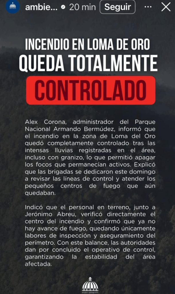 El Ministerio de Medio Ambiente y Recursos Naturales informó que el incendio forestal registrado en la zona de Loma del Oro, al norte del Parque Nacional Armando Bermúdez, fue “totalmente controlado” esta tarde, gracias al arduo trabajo coordinado entre bomberos forestales, guardaparques y comunitarios de la zona de Mata Grande.